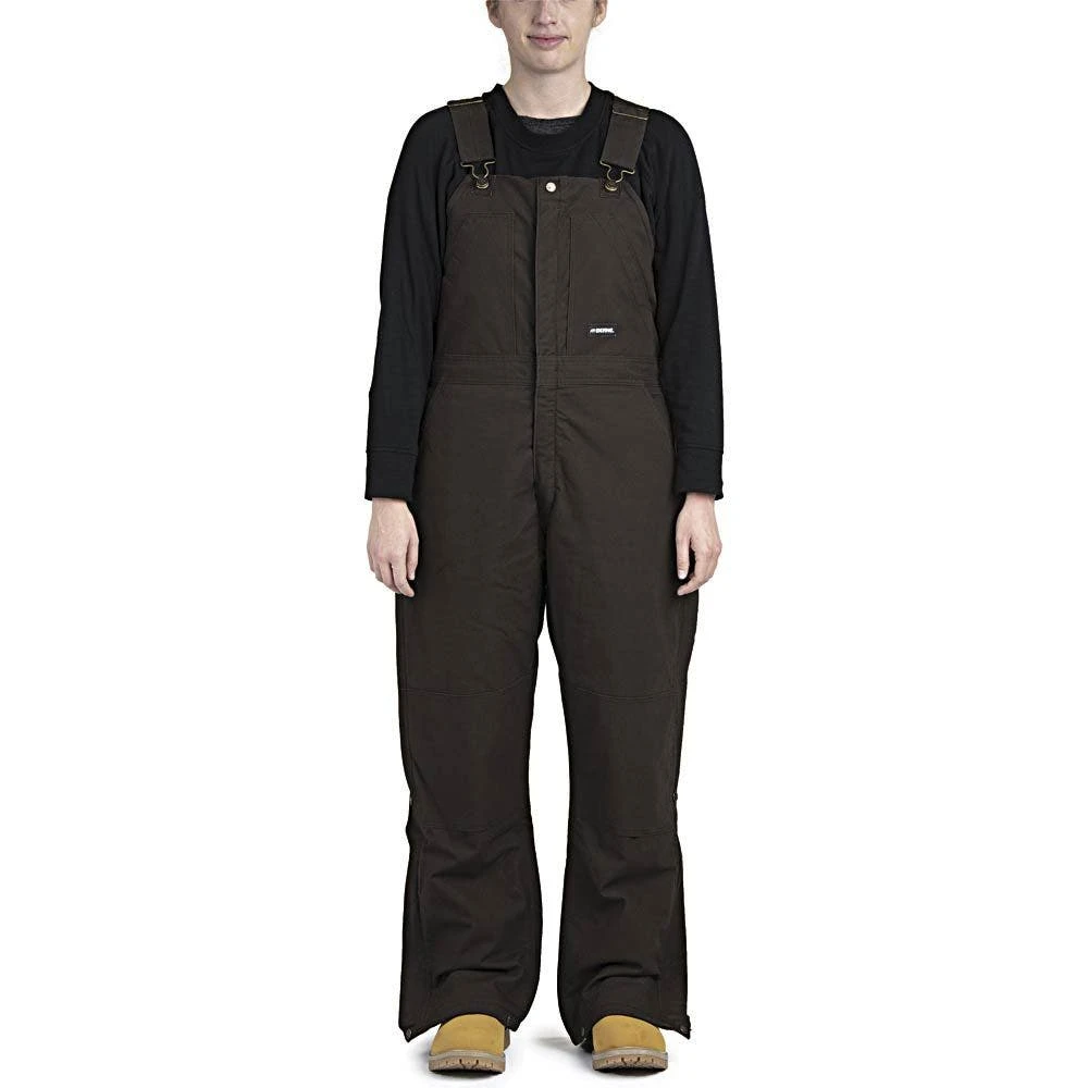 The key features of the BERNE Women’s Softstone Insulated Bibs include durable cotton duck fabric, heavy duty nylon reinforcement at the leg hems, adjustable straps and leg snaps, sturdy brass zipper, multiple pockets, built-in hammer loop, four needle stitching, elastic inserts, and insulation for warmth.