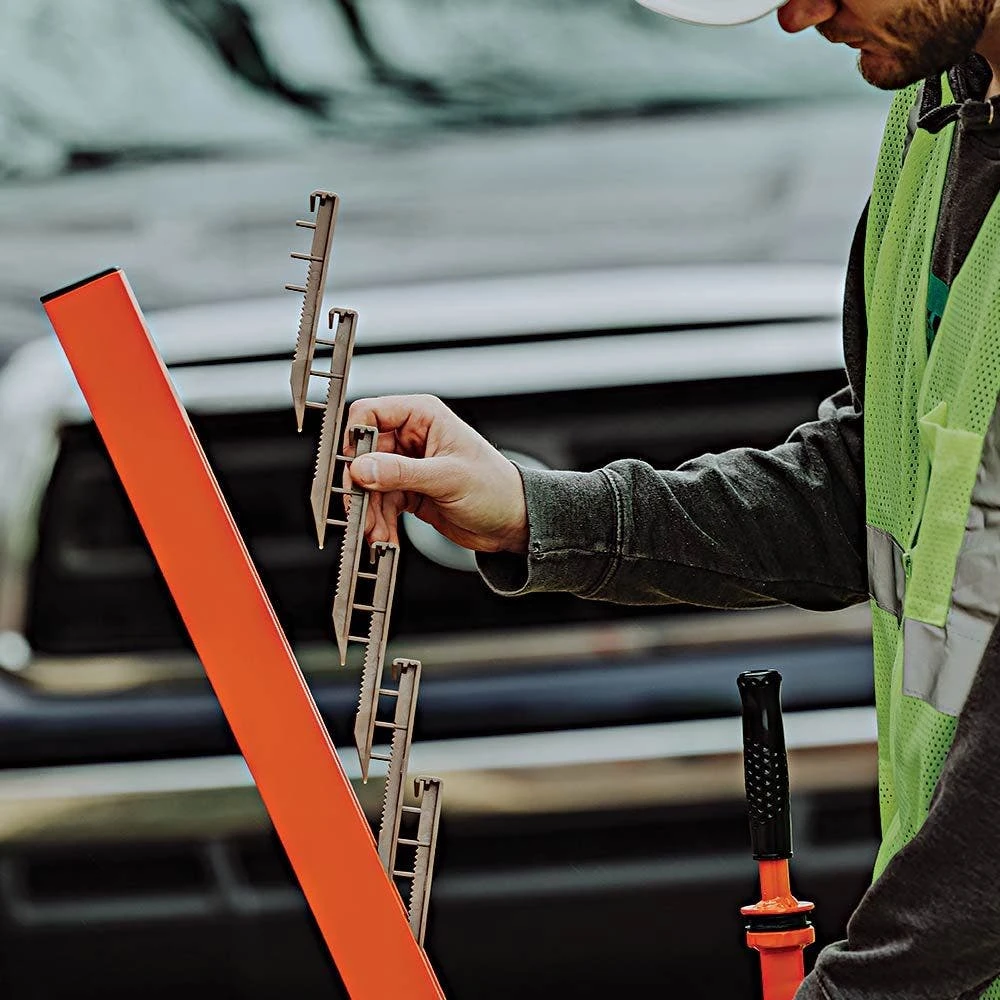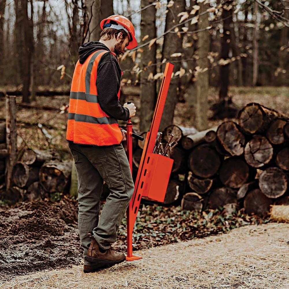 The steel slide hammer with rubber bushings reduces impact, noise, and fatigue, allowing for seamless stake installation with each step. The magazine-style loader holds up to 15 stakes for quick and jam-free staking, while the integrated hopper keeps over 150 stakes on hand to minimize restocking.
