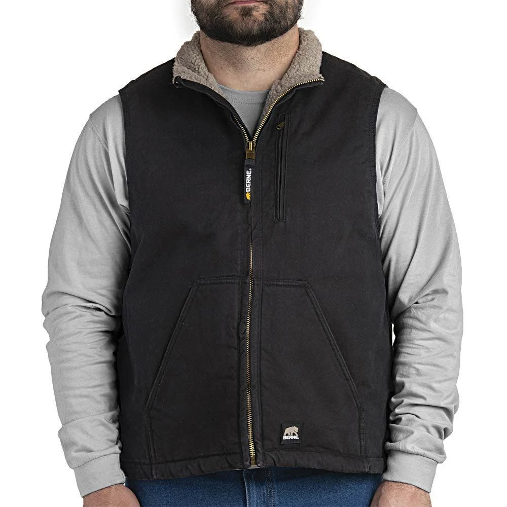 The BERNE Canyon Vest is made of 100% cotton duck shell and 100% polyester Sherpa style inner liner.