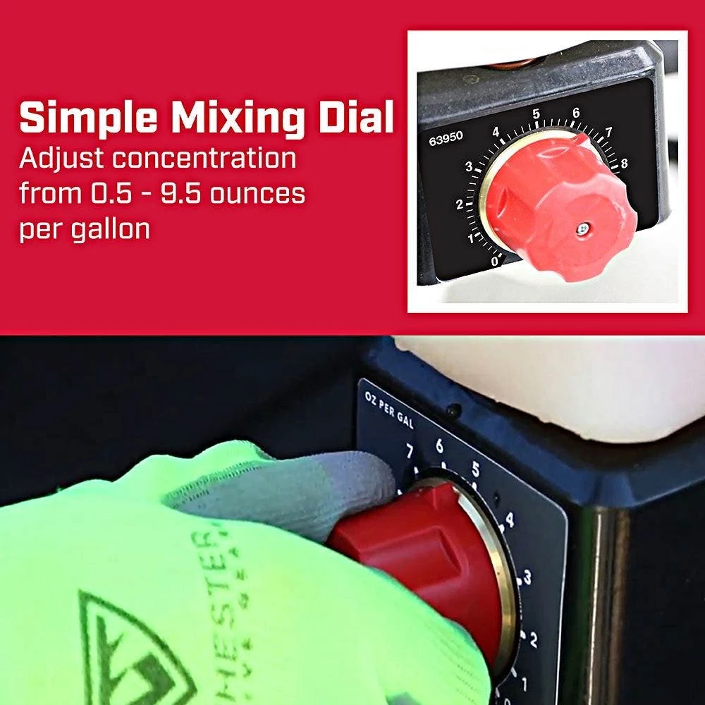 - Simple dial control accurately adjust chemical concentrate from 1 – 10 oz per gallon