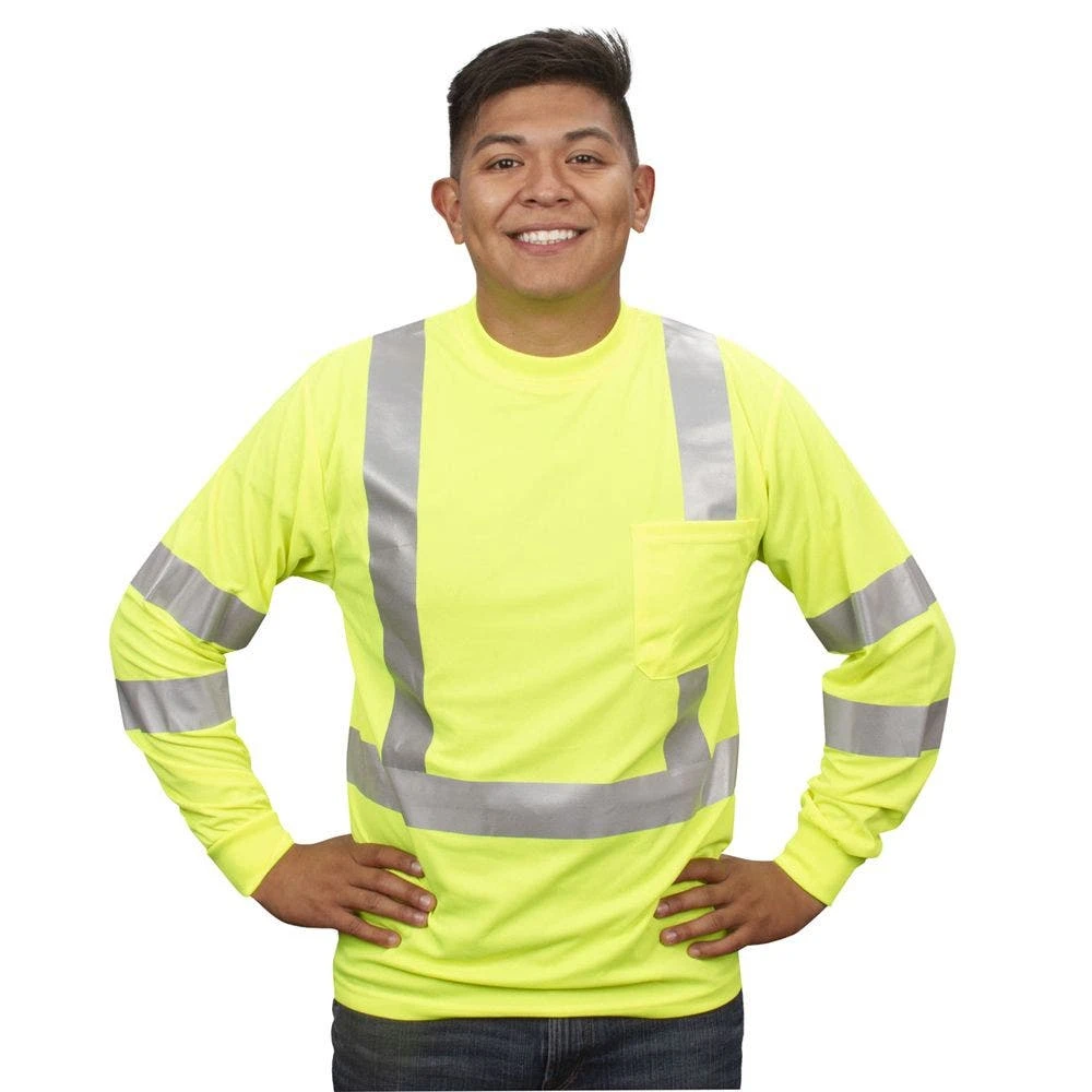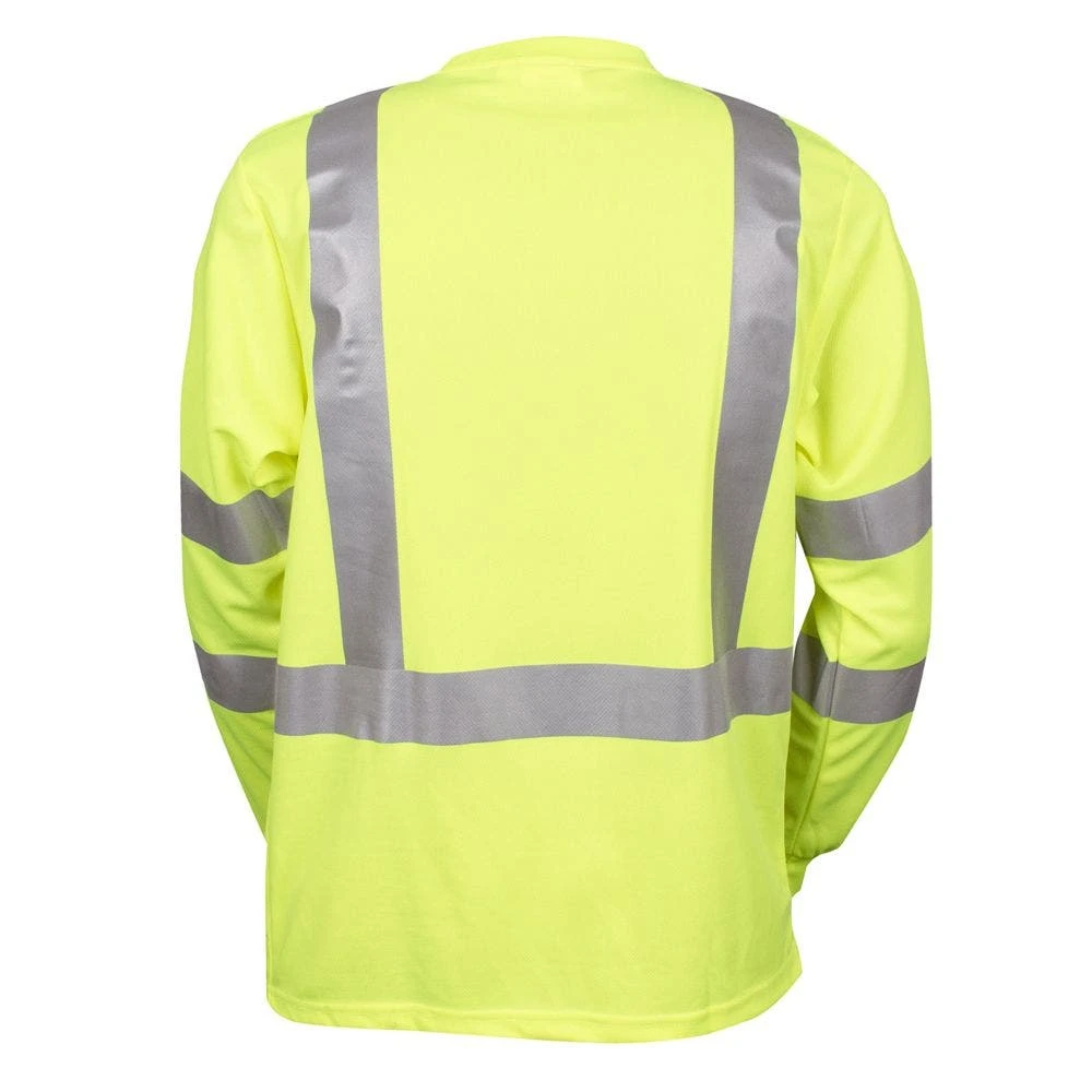 The tee is made of hi-vis lime polyester Birdseye mesh fabric with 2-inch reflective tape and a chest pocket.