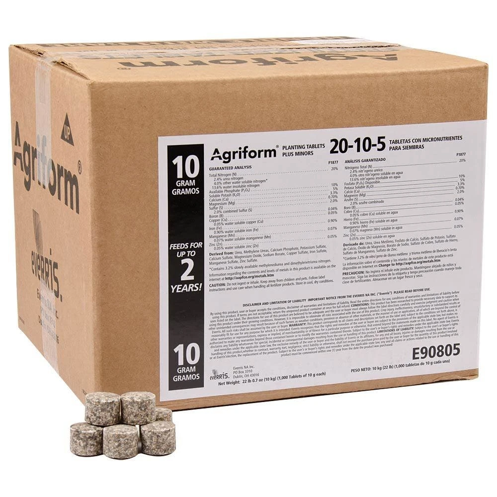 A case of Agriform’s 2 Year Release Fertilizer Tablets contains 500 tablets, each weighing 21g and formulated with a balanced 20 10 5 nutrient ratio.