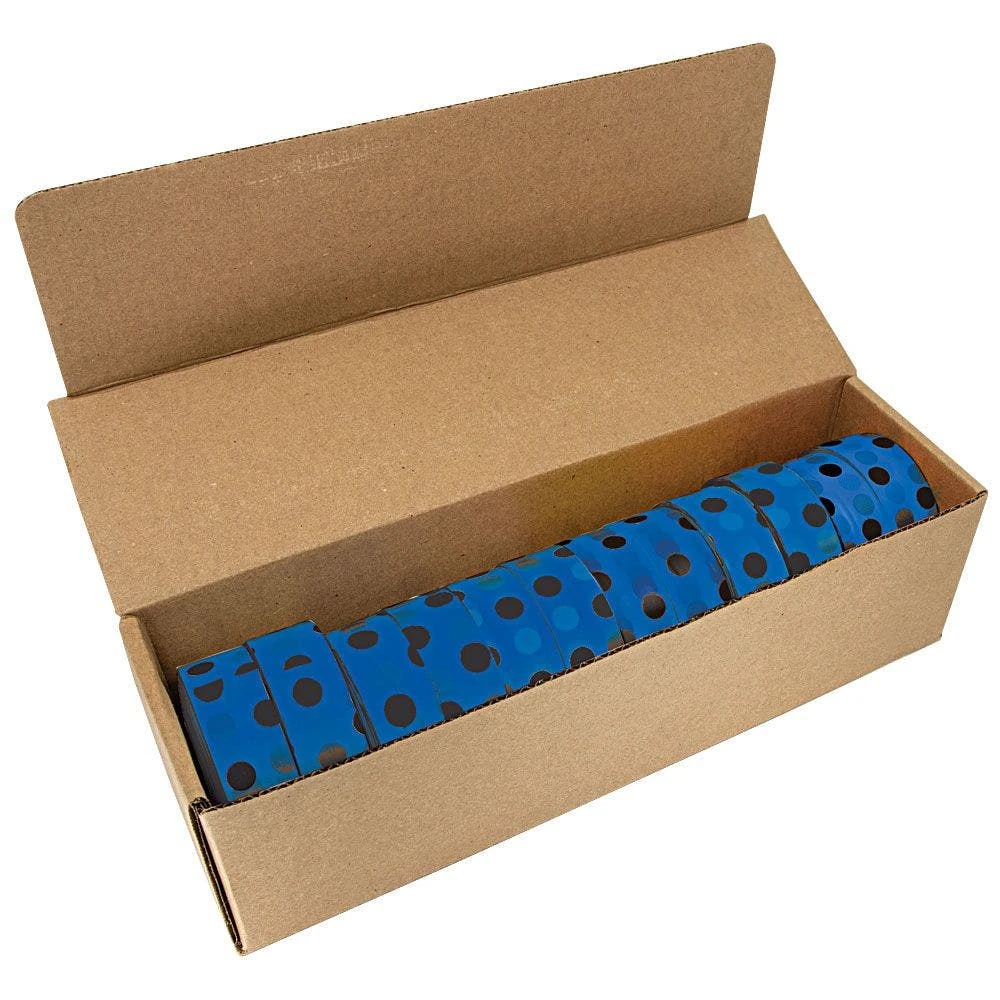 - This box contains 12 rolls of black/blue polka dot tape.