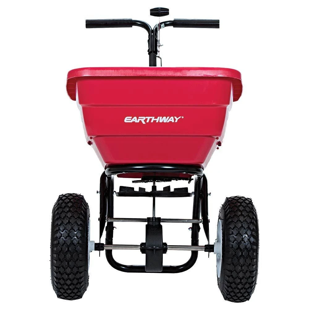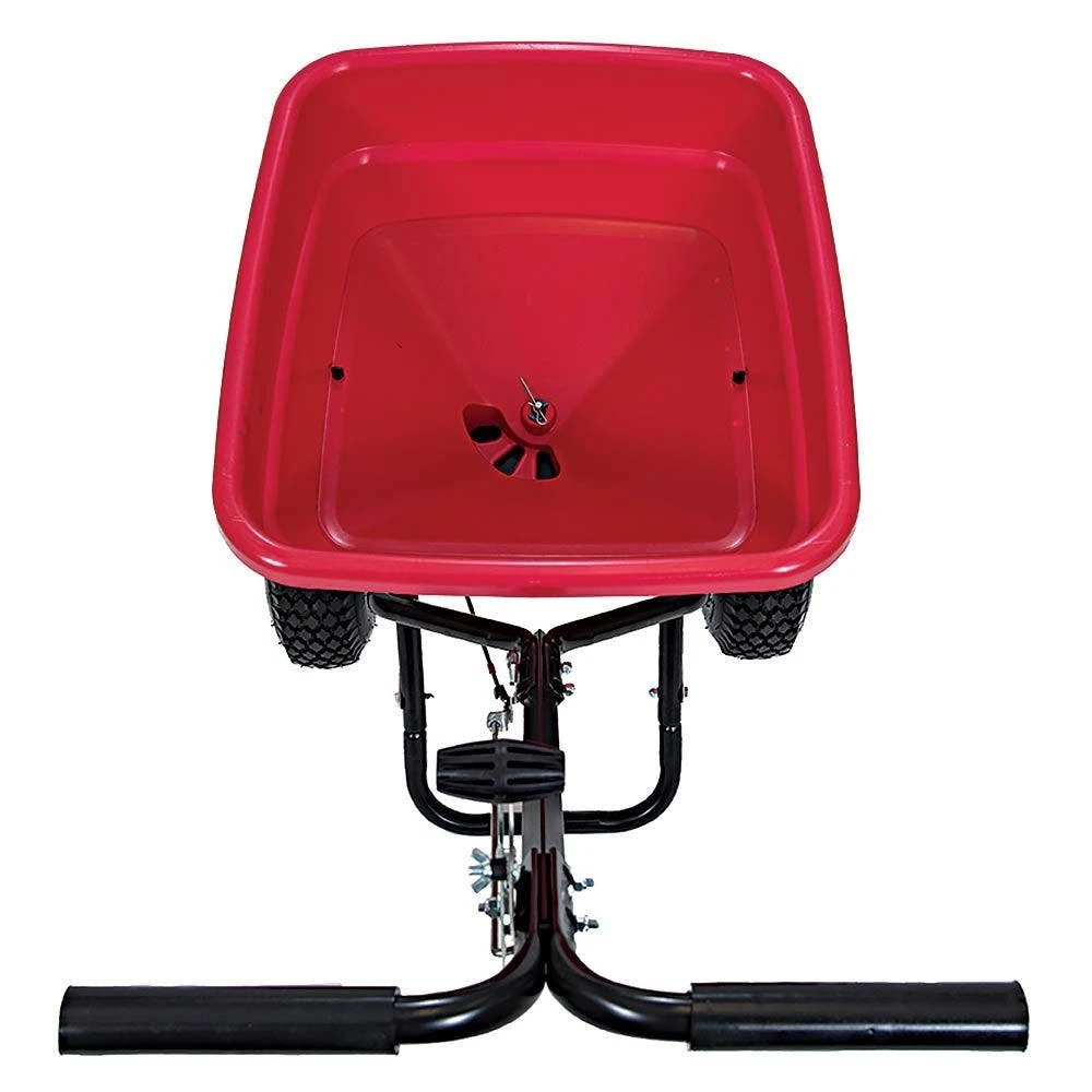 The FLEX SELECT series broadcast spreader is designed for durability and reliability. The frame is epoxy powder coated to ensure a long-lasting finish that can withstand outdoor elements. The spreader features 13″ diameter tires on rust-proof heavy duty poly rims with a diamond tread pattern that provides good traction on varying terrains. The two-position handle height adjustment allows for a custom fit to the operator, enhancing comfort and reducing fatigue during extended use. The On/Off lever includes an adjustable solid linkage that is reliable and enables precise calibration for accurate spreading year after year.