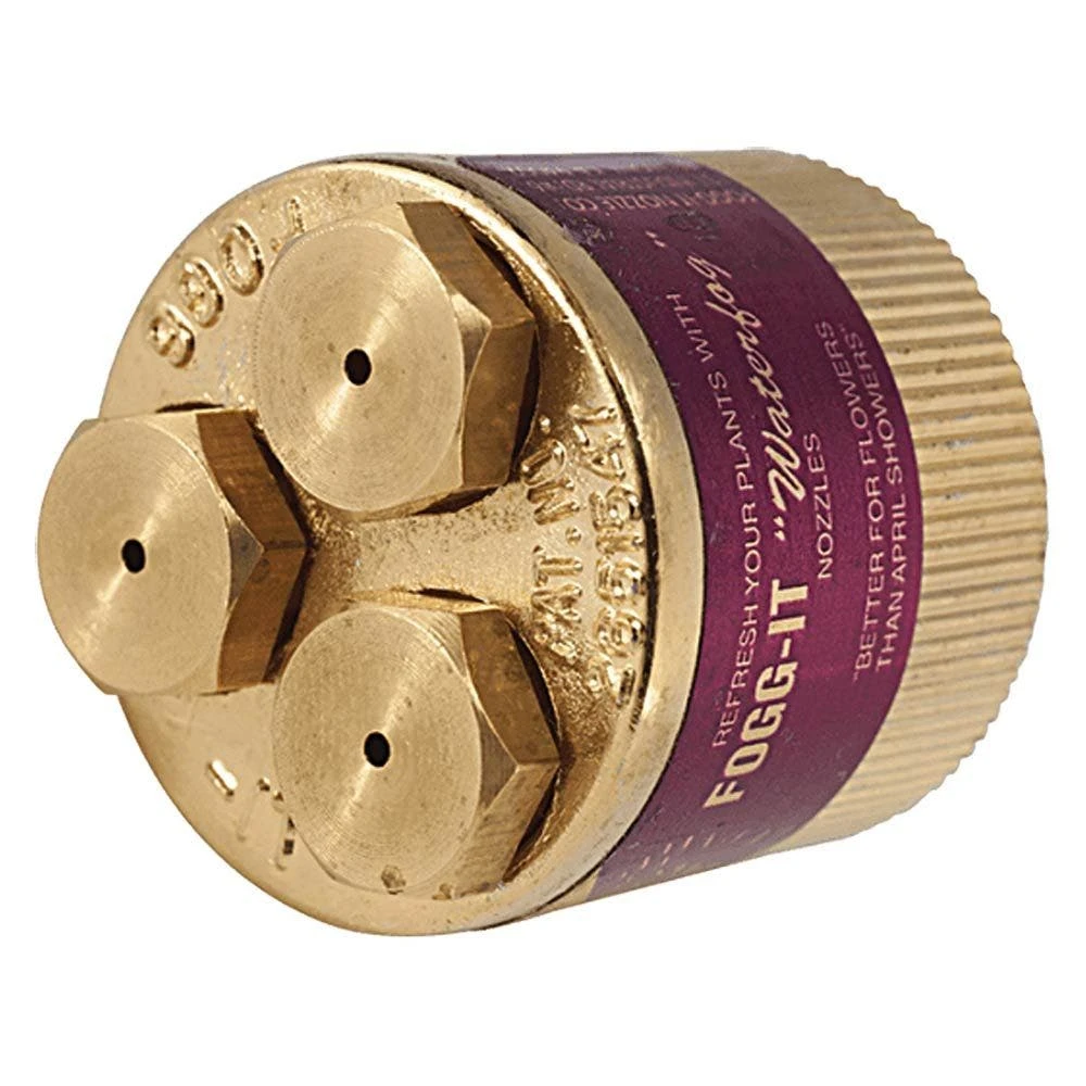 The brass jet spray nozzle features three brass jets that provide a solid, fog-like spray for optimal coverage and precision in watering tasks.