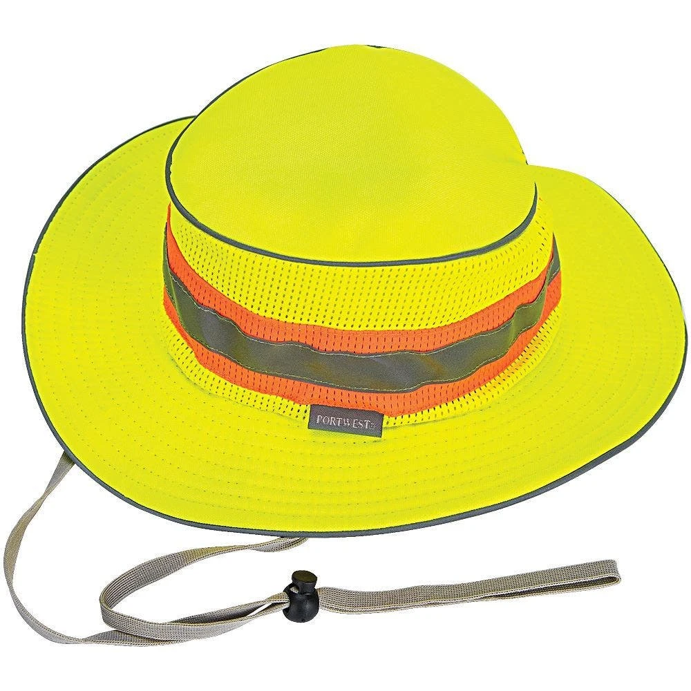 The high visibility ranger style hat features reflective piping, a bright yellow color for visibility, a full brim for sun protection, and a mesh crown for ventilation and comfort.