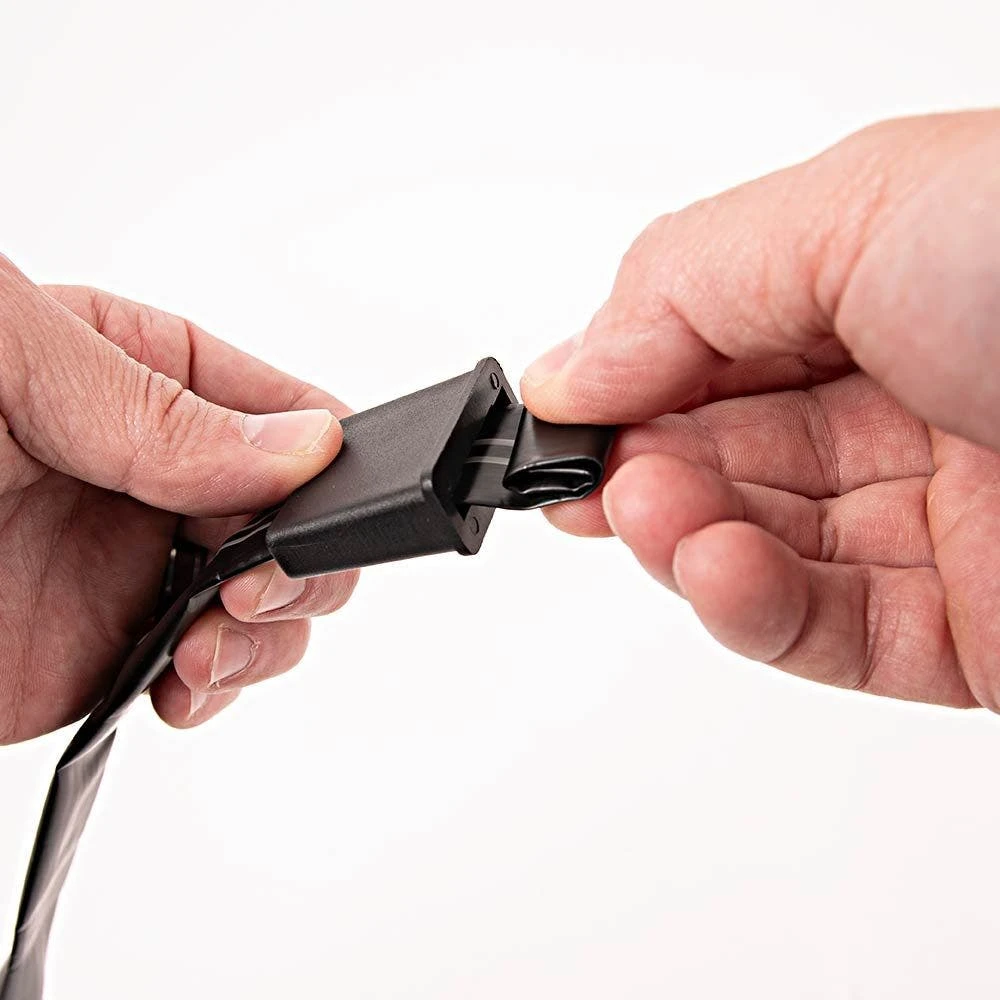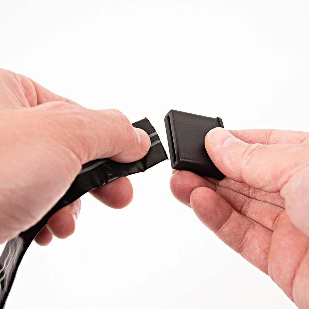 To use these closures, start by inserting the drip tape into the narrow side of the fitting. Next, extend the tape several inches past the larger opening and fold over the extended end several times. Finish by pulling the tape back into the cap and locking it into place.