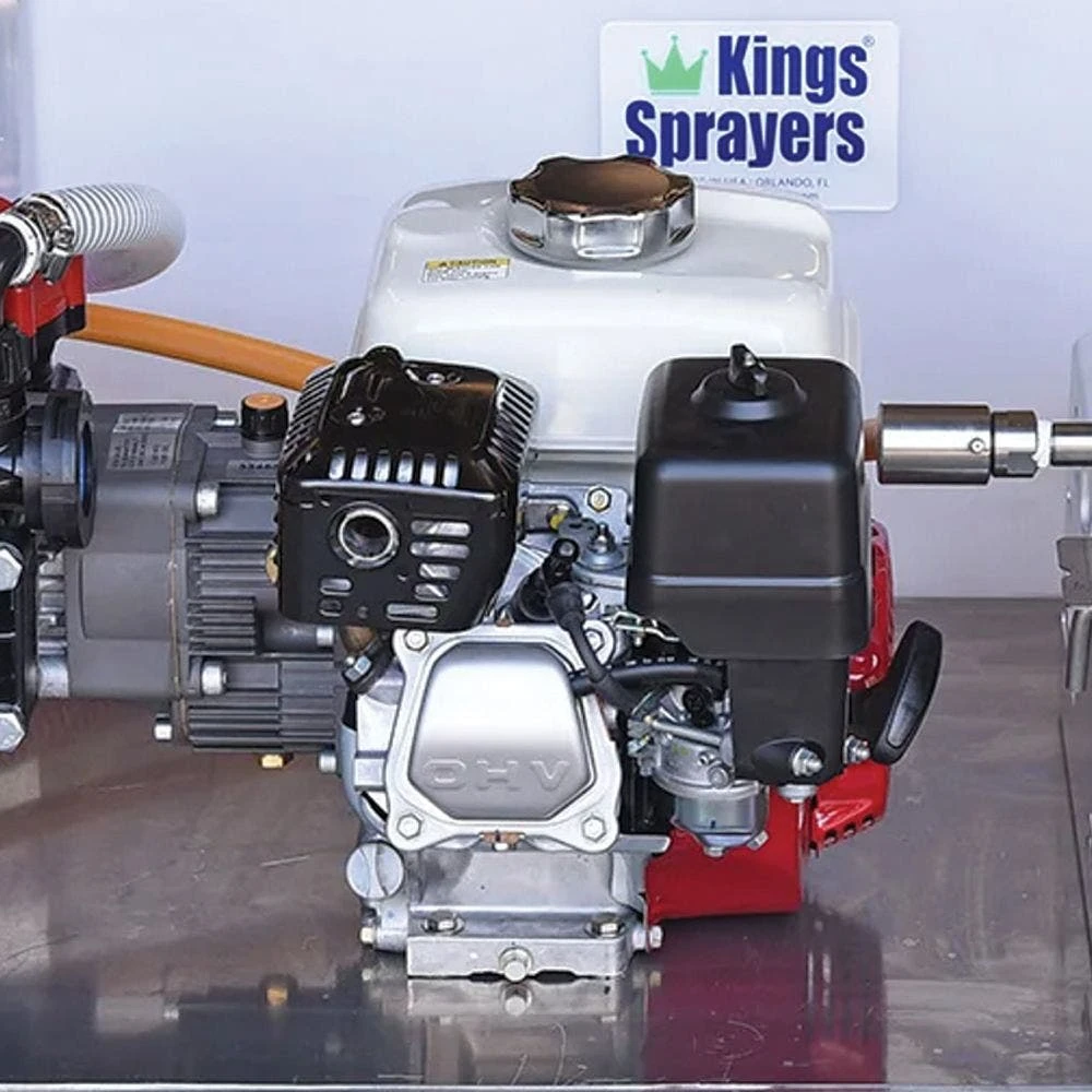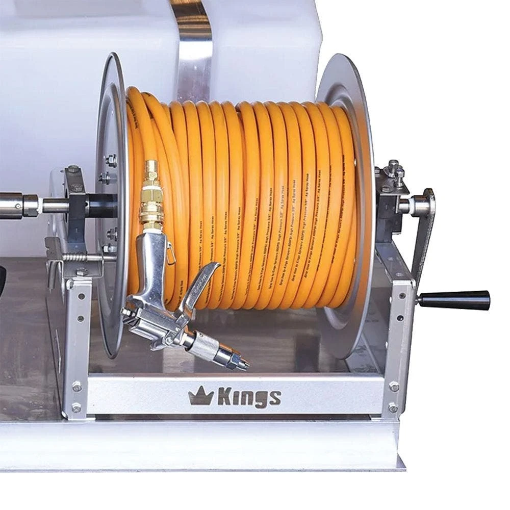 Kings 100 Gallon Low Profile Skid Sprayer comes with a 5.5 HP GX160 Series Honda Engine, a Hypro D30GRGI Diaphragm Pump with a maximum flow rate of 9.5 gpm, a 12-inch manual hose reel with 150 ft of 3/8 inch spray hose, an aluminum frame, and a pistol style adjustable spray gun.