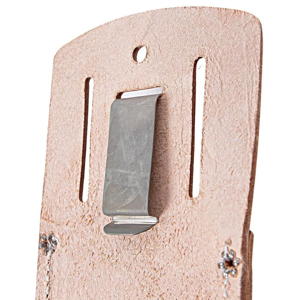 The Leonard Leather Sheath with Clip and Belt Slot has slots to slide a belt through and is equipped with a metal clip for quick on/off. It can also be hung using the hole at the top.