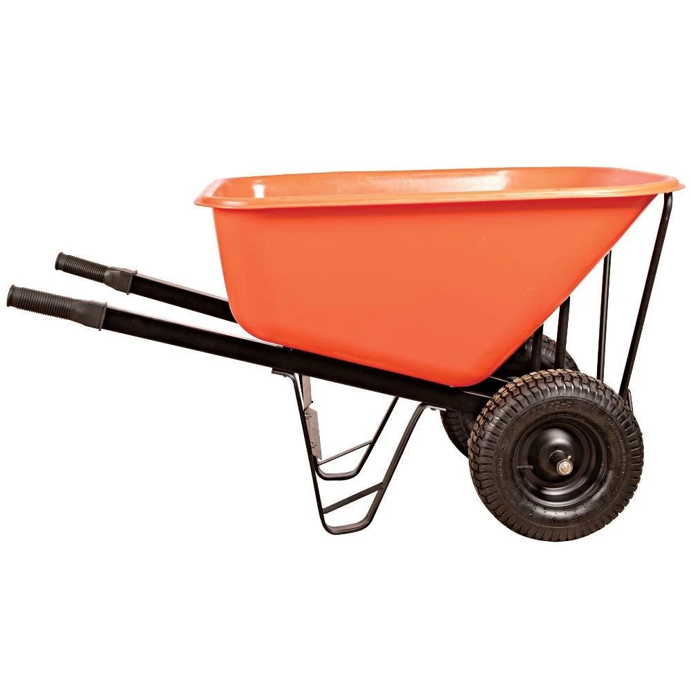The tray of this wheelbarrow is made from durable poly material, while the handles are made of 18 gauge galvanized steel with black powder coat for extra corrosion resistance.