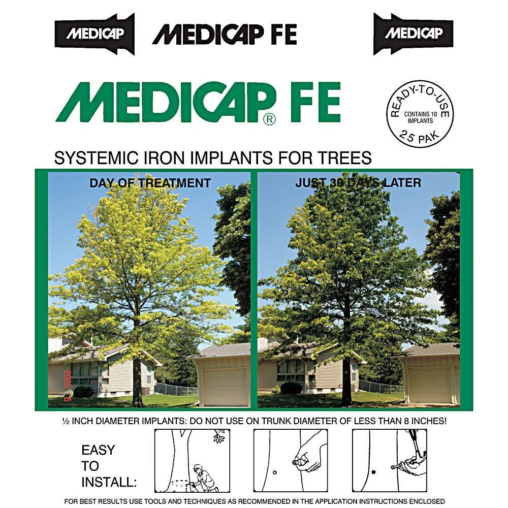 One Medicap Iron Implant Capsule equals 4 pounds of “chlorosis mix” or 2 gallons of foliar spray. Directions for use are included with the product.