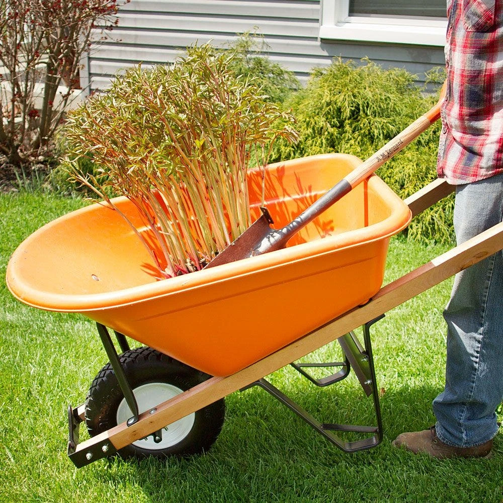 This wheelbarrow features one narrow flat free tire with a diamond tread pattern.