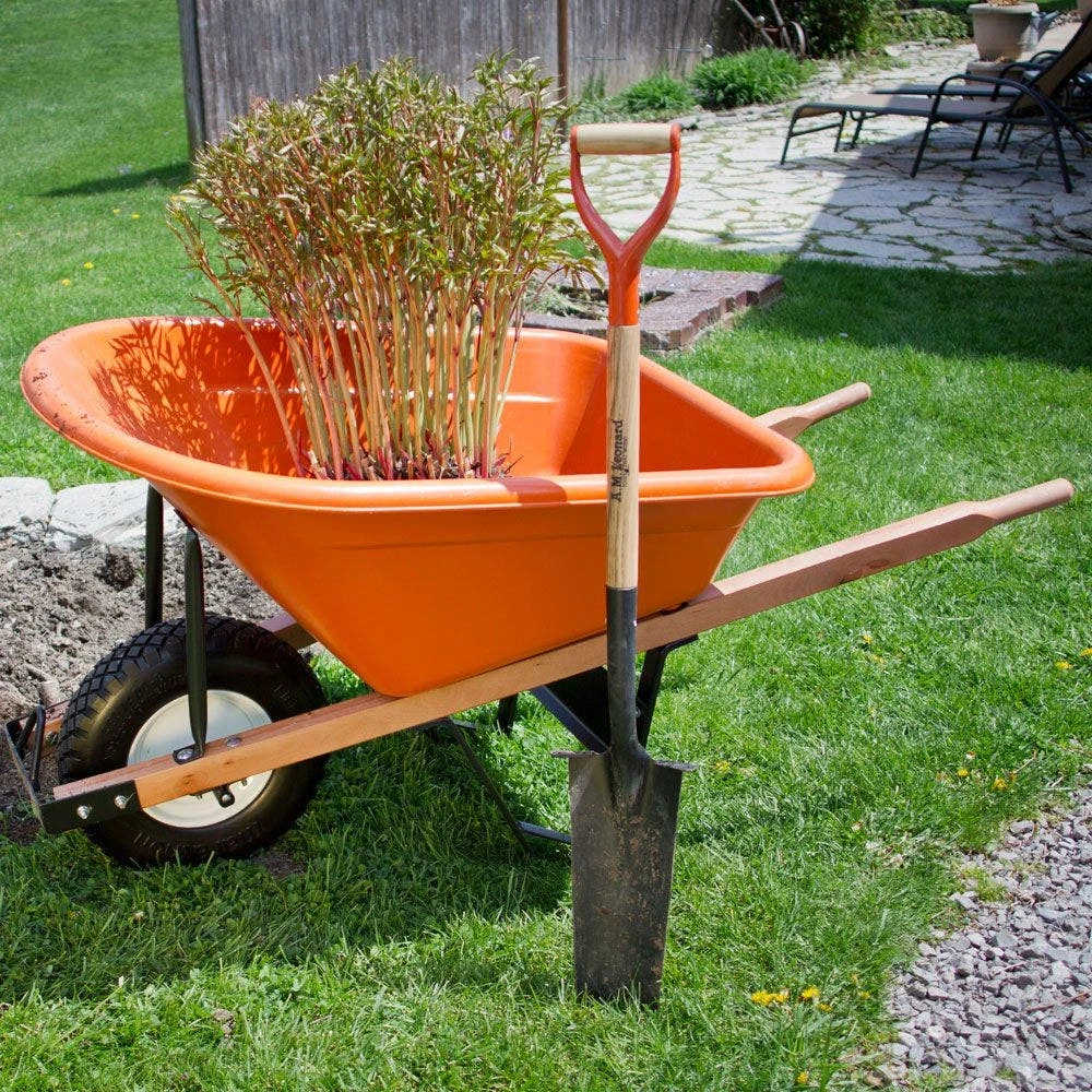 The Leonard Poly Tray Wheelbarrow includes features such as a low profile design, extra thick hardwood handles, welded tray support, heavy duty undercarriage, wide carriage head bolts, precision ball bearings, and a 5/8 inch axle for increased stability and maneuverability when transporting heavy loads.