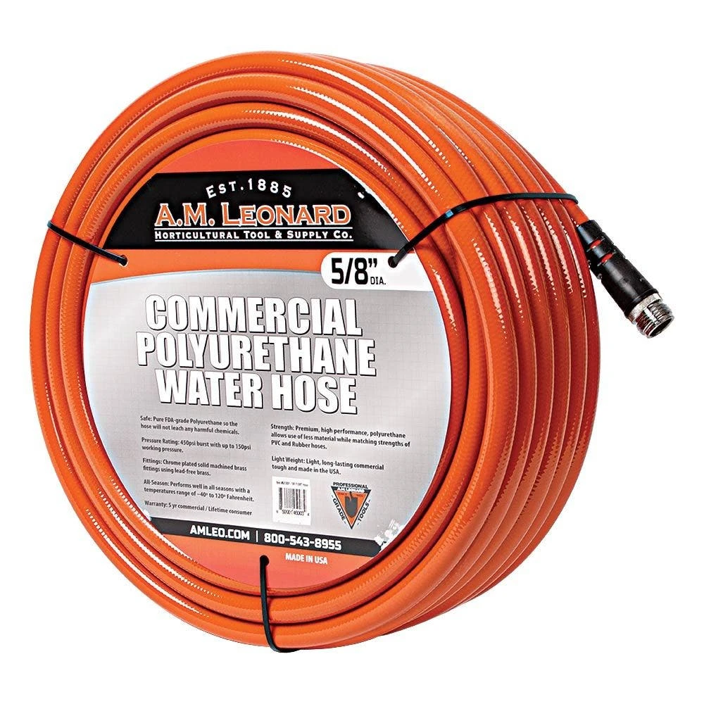 The Leonard Polyurethane Hose has a diameter of 5/8 inches and a length of 100 feet.