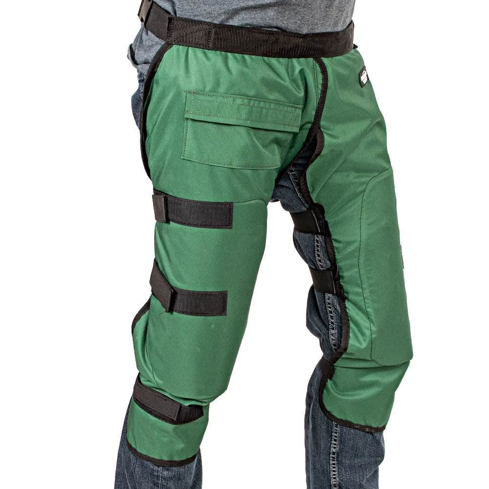 The chaps feature a one piece design, maximum coverage for thighs, knees, and groin, quick release snap buckle, stretchable straps with hook & loop fasteners, breathable outer layer, drilled interior thigh panels, durable materials, and included kneepads.