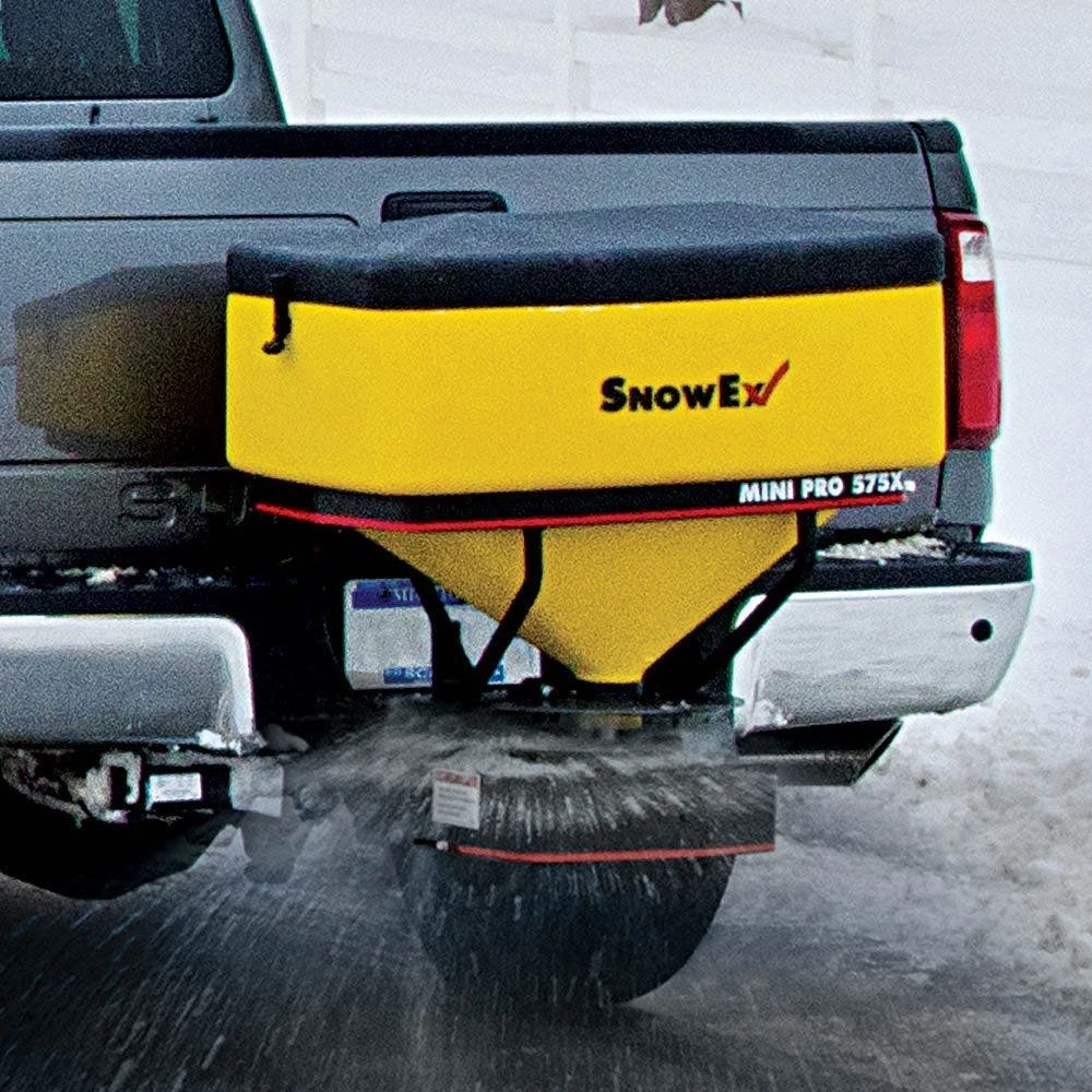 The SnowEx Tailgate Pro Spreader can distribute rock salt, calcium flakes, calcium chloride pellets, or other ice melting products.