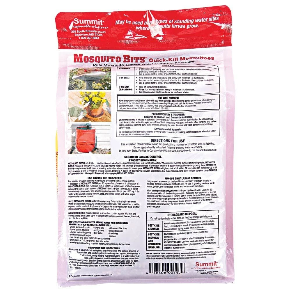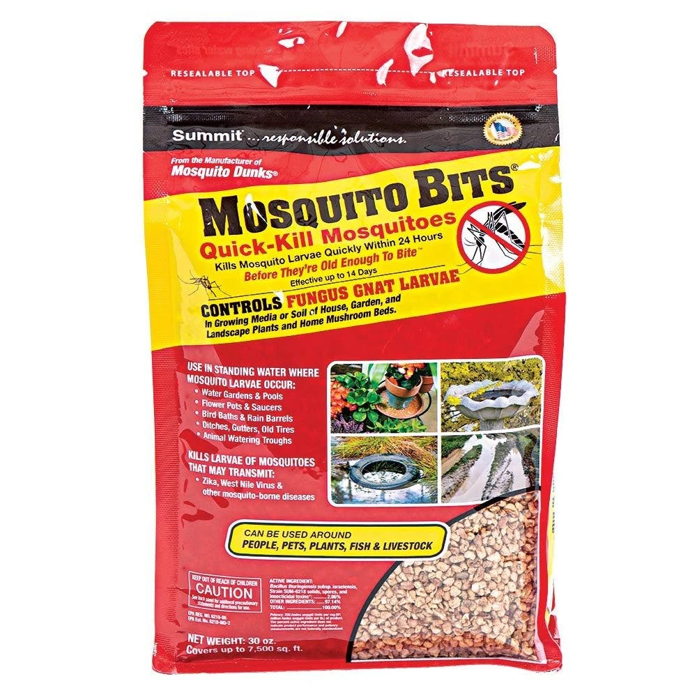 Summit Mosquito Bits is a granular product that kills mosquito larvae within hours of application. It releases a natural bacterium called Bacillus Thuringiensis Israelensis (BTI), which eliminates mosquitoes regardless of species.