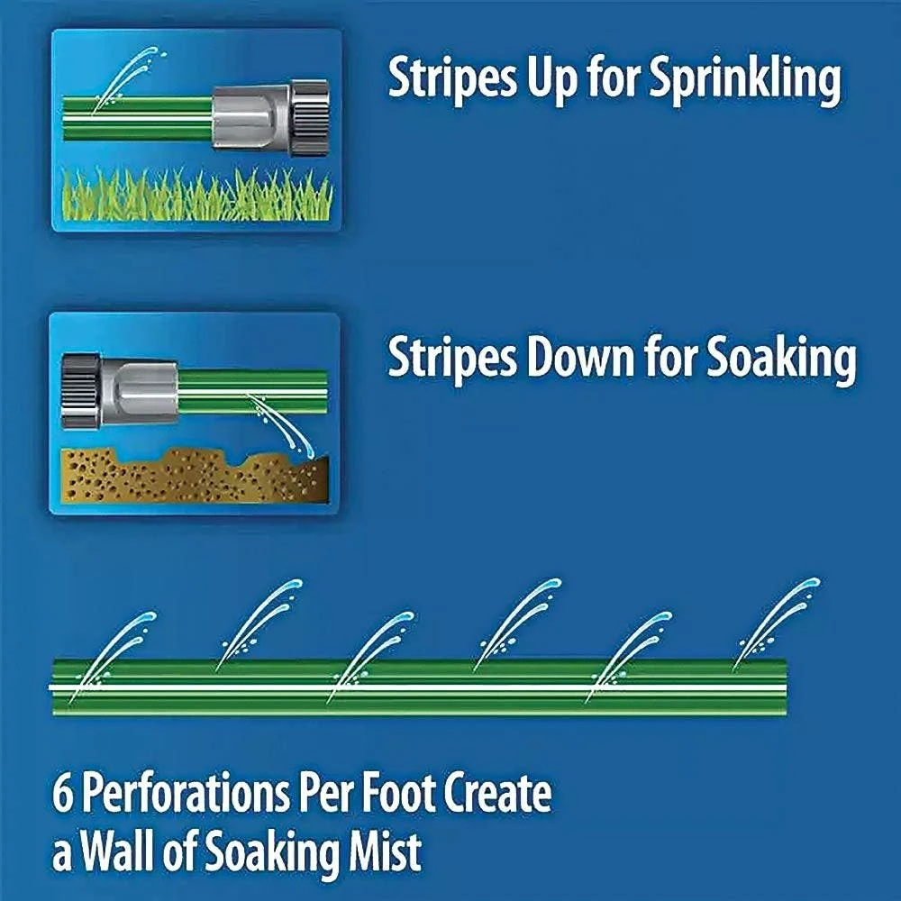 - Simply place the stripe of holes up for a sprinkler that sprays a wall of mist, or place the stripe down for a traditional soaker hose.