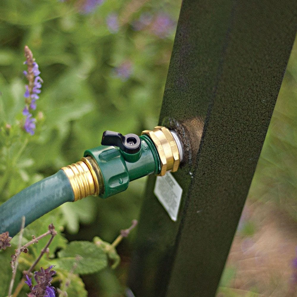 To install the Full Rotation Free Standing Hose Swivel Reel, center the Post Mount Receiver in a hole at least 8″ deep and add quick-setting concrete. Allow it to harden according to the manufacturer’s instructions. Please note that old pictures may show a shut-off valve on the Mid-Section Post, but the product does not come with one.