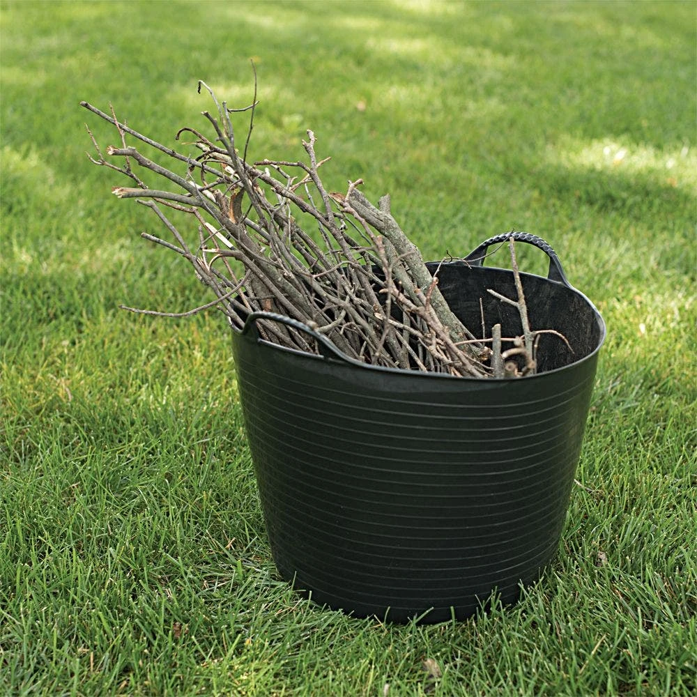 The Gorilla Tub Trug, Small has super strong handles, a beveled lip to make sweeping into it easier, flexible sides for shaping against a wall or floor, and reinforced ribbing for extra strength. It also has the capacity embossed on the inside wall and is made from 100% recycled material.