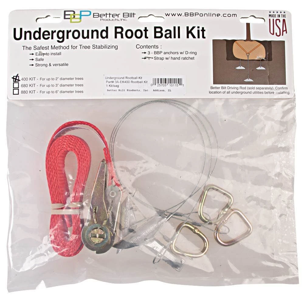 The Underground Root Ball Support Kit includes three pre-assembled earth anchors with wire cables and D rings, and one hand ratchet strap with a length of 20 feet and load capacity of 500 pounds.