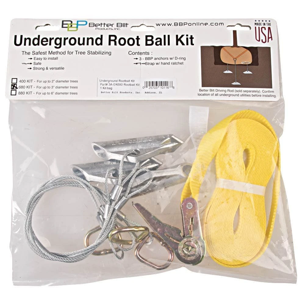 Each Underground Root Ball Support Kit includes 3 earth anchors, pre-assembled with wire cables and D rings, and one hand ratchet strap. The total weight must not exceed 1,100 pounds.