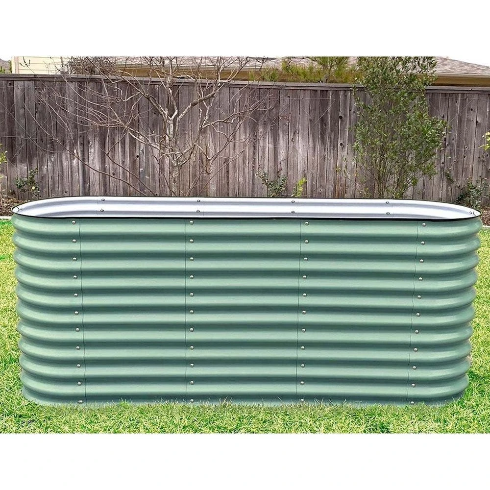 The Vego Extra Tall 6 in 1 Modular Metal Raised Bed stands 32 inches tall, promoting healthy root growth. It is quick and easy to build with multiple configurations, and the metal is long-lasting and coated with Aluzinc for durability. The bed is painted with a specialized paint for food-grade farming, and comes with a heavy-duty rubber safety strip.